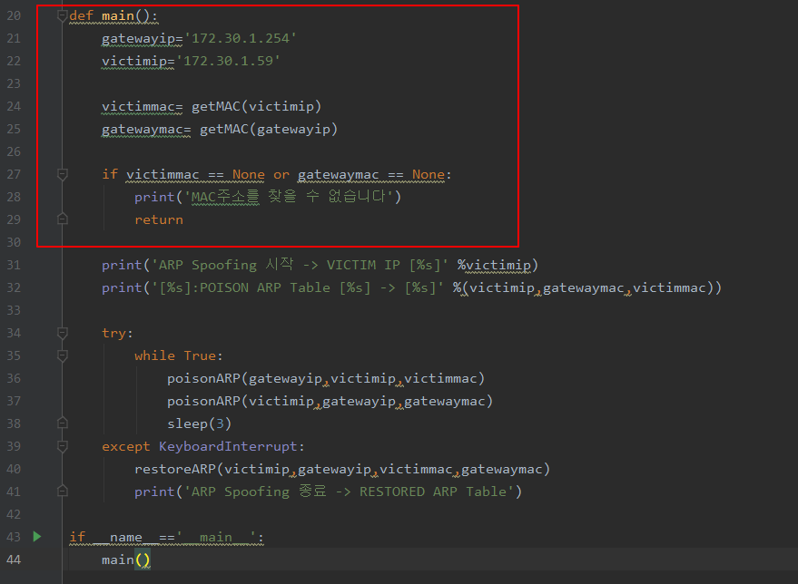 게이트웨이의 IP주소와 희생자 IP주소를 지정하고 getMAC()함수를 이용해 각각의 MAC주소를 얻습니다. 만약 MAC주소를 얻지 못하면 프로그램을 종료하기 위해 리턴을 한다.