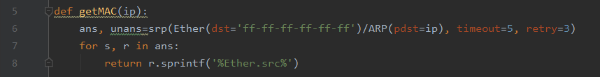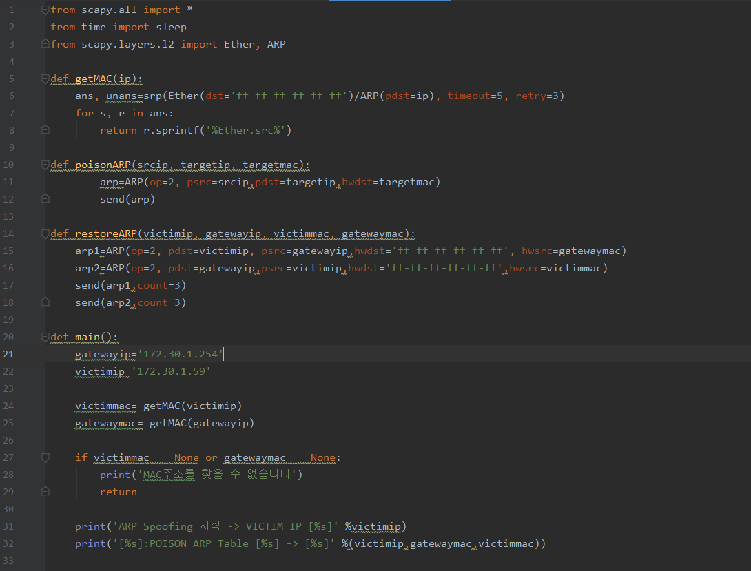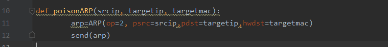 poisonARP(srcip, targetip, targetmac)은 Scapy모듈의 ARP()객체를 이용하여 ARP패킷을 구성하고 Scapy모듈의 send()로 ARP패킷을 전송한다.