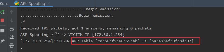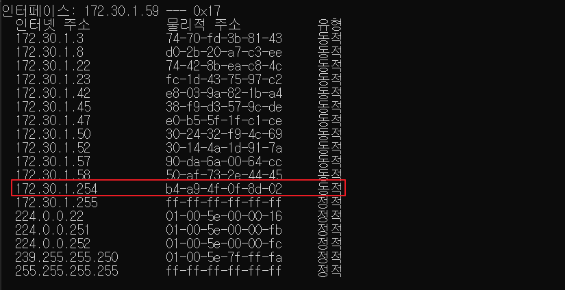 MAC 주소: "c0:b6:e6:55:4b" ----> 공격자 MAC주소로 "b4:a9:4f:0f:8d:02"로 바뀌었다.