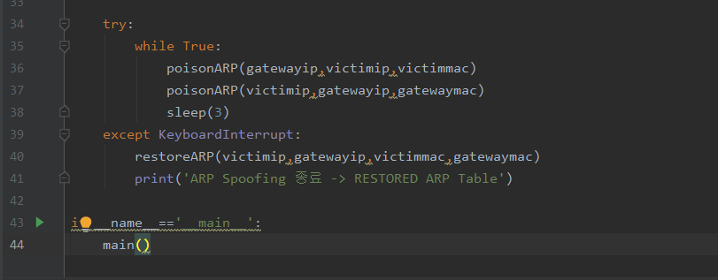 21라인부터 ARP 스푸핑의 메인 함수이다.