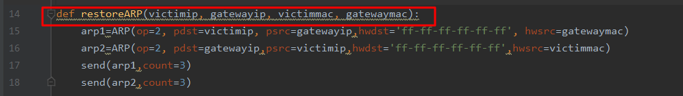 restoreARP(victimip, gatewayip, victimmac, gatewaymac)은 희생자 컴퓨터와 게이트웨이의 ARP테이블을 원상 복구하는 함수이다. ARP 스푸핑을 통한 해킹 작업이 마무리되면 이 함수를 호출하여 피해 컴퓨터 및 게이트웨이의 ARP테이블을 원래대로 복구함으로써 자신이 해킹 피해를 입었는지 전혀 알 수 없게 하기 위함이다.