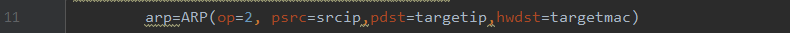 여기서 11라인은 보내는 srcip="보내는 컴퓨터의 IP조소", targetip="목적지 컴퓨터 IP주소", targetmac="목적지 MAC주소"인 ARP Reply 패킷을 구성한다.