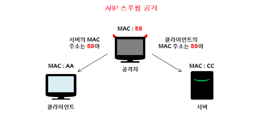 해당 MAC주소로 정보를 전송하게 되는데 만약 이 MAC주소를 해커의 MAC주소를 바꾸게 된다면? 당연히 모든 데이터는 공격자에게 전송하게 된다.