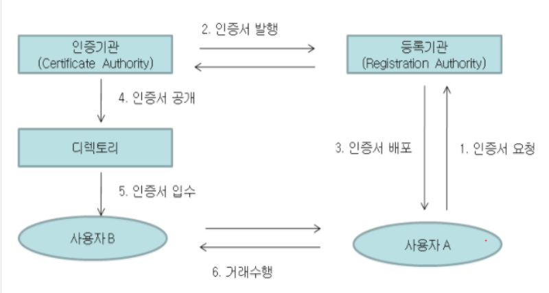 – 사용자가 인증서를 RA에 신청, 신분 검증 후 RA는 CA에 인증서 발급 요청, CA는 암호화 Key(공개키, 개인키) 생성하여 사용자에게 개인키를, 공개키 및 인증서는 인증서 저장소에 저장