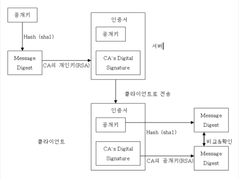 | 서명 검증 | – 수신한 공개 키와 CA 전자 서명을 CA 공개키로 복호화하여 검증 |