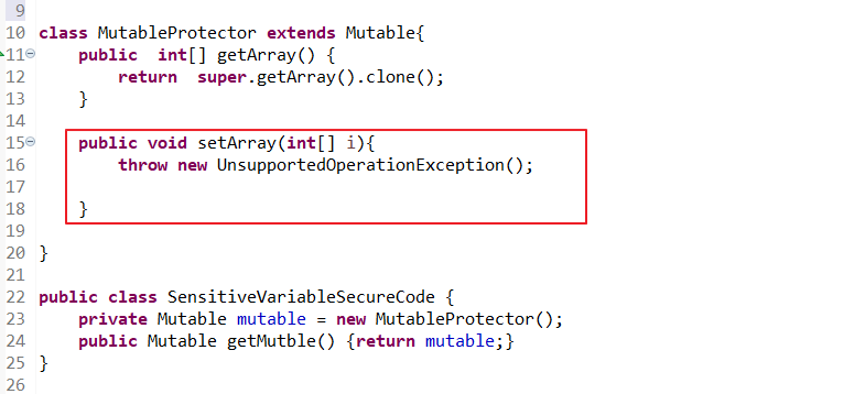 이 솔루션은 Mutable.setArray()를 오버라이드하는 setArray() 메서드를 추가하여 Mutable 객체 변경을 방지한다.