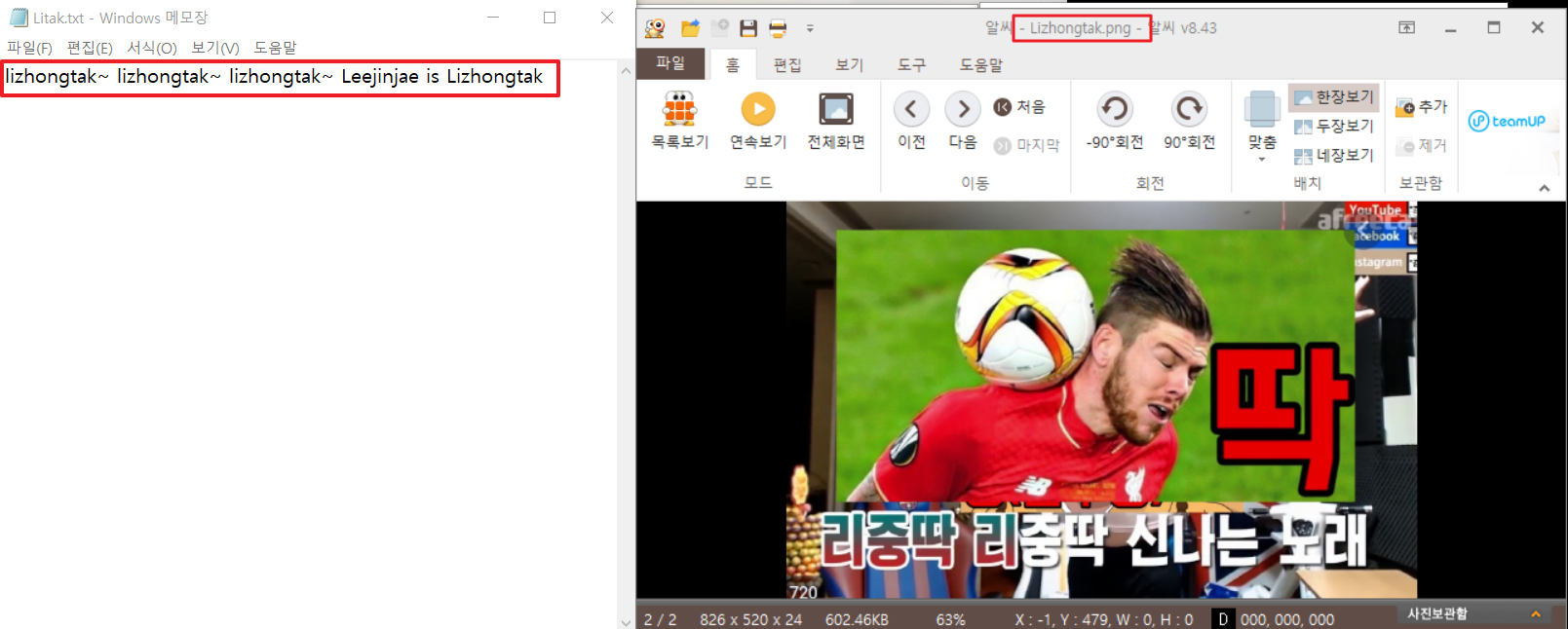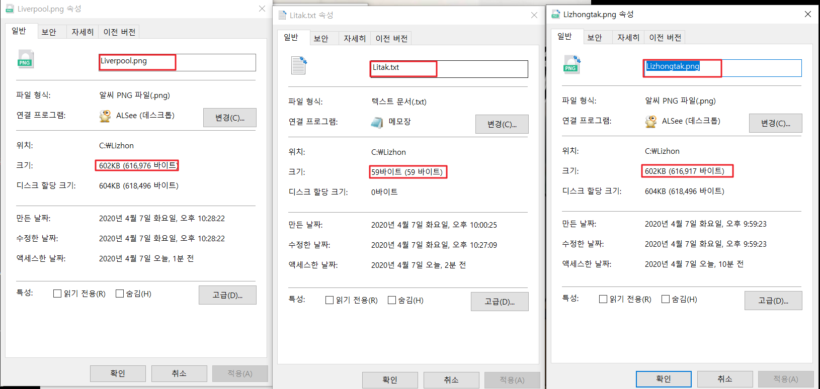 바로 해당 각 파일들의 크기이다. Lizhongtak.png 파일크기는 616.917byte, Litak.txt 파일 크기는 59byte이다. 그렇다 해당 Liverpool파일의 크기가 616.976byte인 이유가 저 둘의 파일의 합친 크기다"616.917+59=616.976byte."
