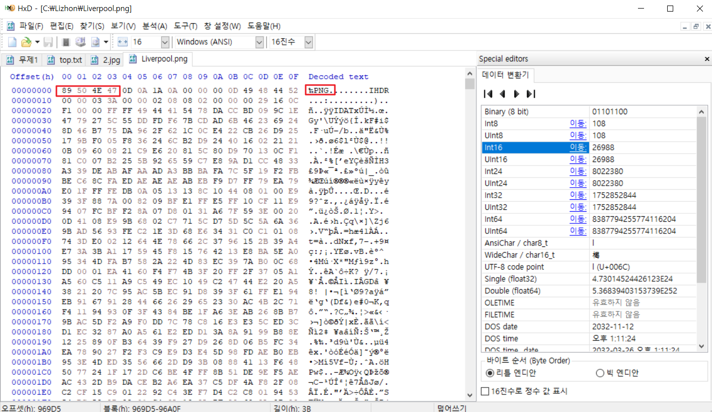 HxD 프로그램에 Liverpool.png를 올려보자 그러면 위에서 말했듯이 Header Signature 코드가 "89 50 4E 47 0D 0A"이라는 것을 알 수 있다.