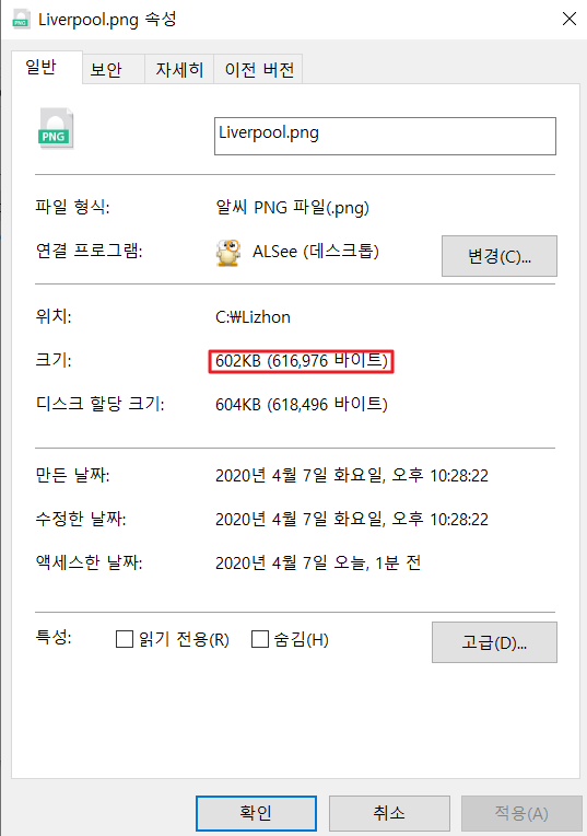 속성에 들어가 파일의 크기를 확인해보자. 현재 Liverpool이라는 파일의 크기는 616.976byte이다.