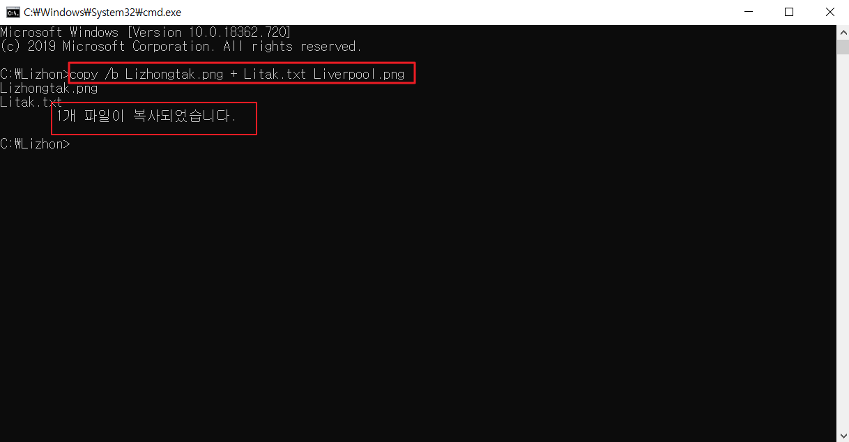 명령어는 다음과 같다. "copy /b 원본이미지 + 숨기고자하는 파일 보여질 숨김이미지.JPG,PNG등." 그러면 위 사진과 같이 1개의 파일이 복사되었다고 한다.