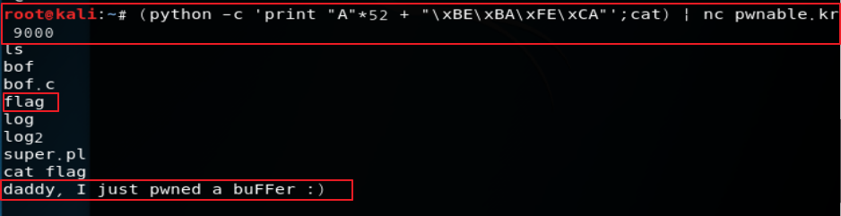 그리고 | 는 A(표준출력) | B(표준입력)를 의미하는데 B(nc pwnable.kr 9000)를 입력해서 A를 출력 하겠다는 의미이다.