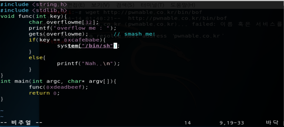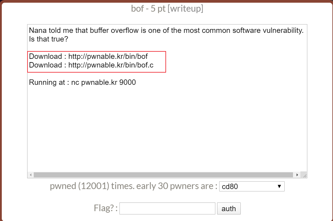 ex)) wget http://pwnable.kr/bin/bof,wget http://pwnable.kr/bin/bof.c 이 두개를 입력하여 다운하면 된다.