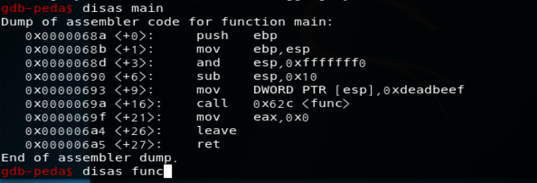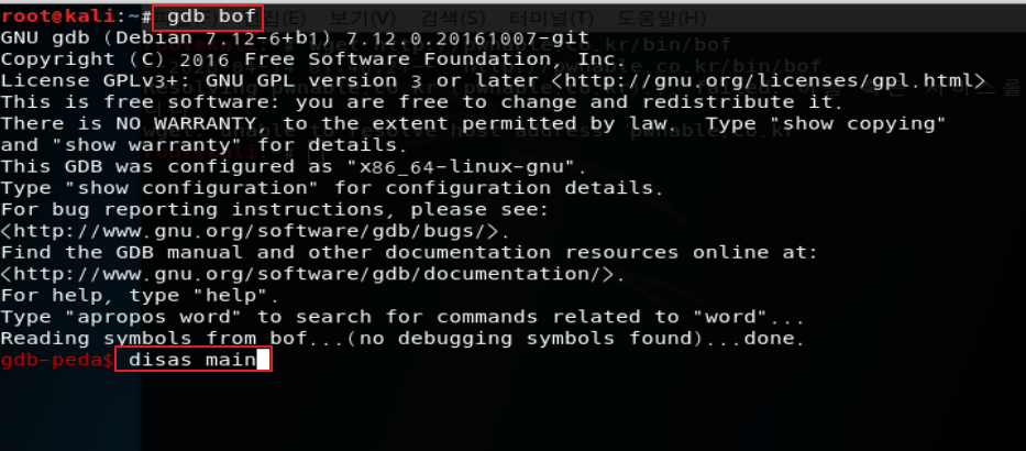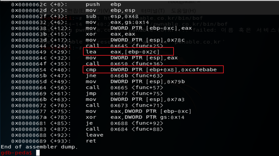 gdb를 이용하여 bof.c를 어셈블리로 분석해보자. disas main과 disas func을 입력하면 된다.