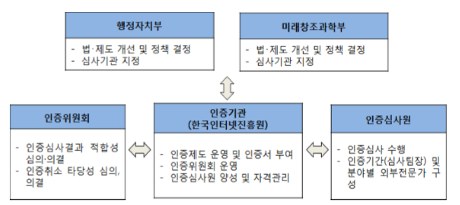 인증기관은 「정보통신망법」에서 인증 업무를 하도록 명시된 기관으로, 한국인터넷진흥원이 지정되어 다음의 업무를 수행한다.