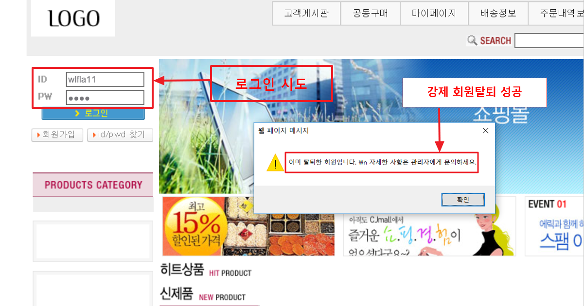 로그인을 재시도 한 결과 회원탈퇴가 된 것을 알 수 있음.
