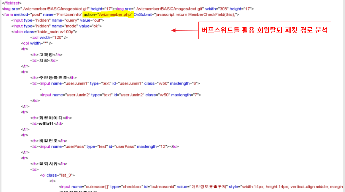 버프스위트 툴로 잡은 해당 회원탈퇴 소스코드
