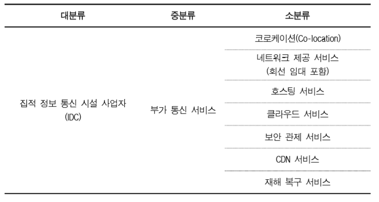 1. 코로케이션 서비스(Co-location): IT 시스템을 설치·운영할 수 있는 상면 공간임대 및 전기, 시설, 설비 등 관리 서비스