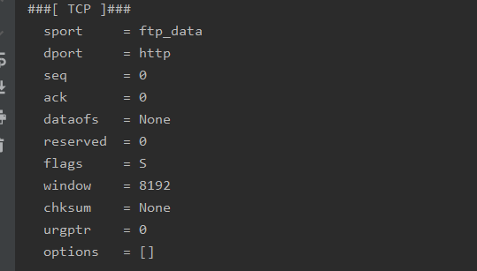 실행 결과 출발지 포트 항목은 20번(FTP-DATA)으로 설정이 되어있다. 목적지 포트 번호 항목에는 80번(HTTP)이 설정됐다. TCP 플래그 항목에는 S(SYN을 의미함)신호로 설정됐고, 윈도우 항목에는 8192가 설정됐다.