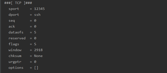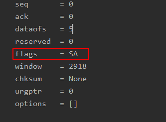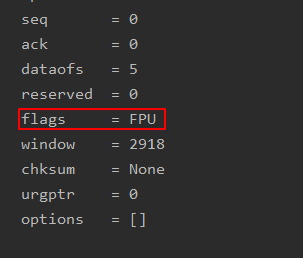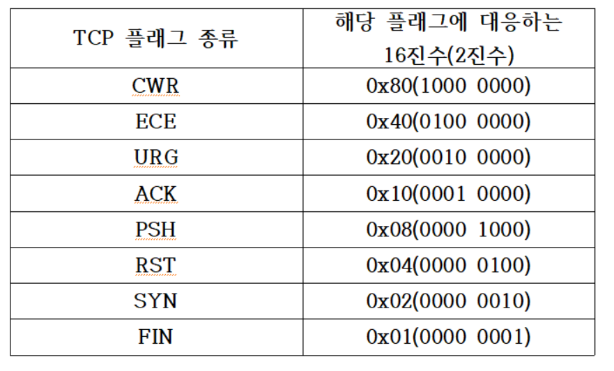 그렇다면 기본으로 설정된 TCP 플래그 항목을 변경하고자 한다면 어떻게 해야 될까? scapy모듈에서는 16진수를 이용하면 된다.