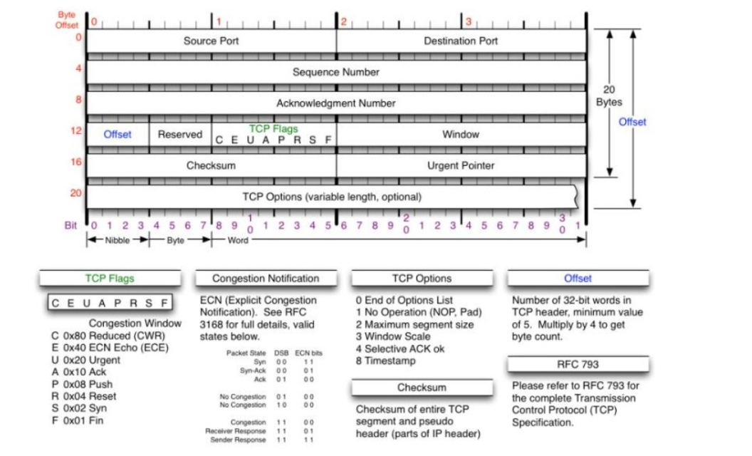 offset의 5는 TCP 헤더 길이와 관련해 가로 4바이트와 세로 5행을 곱합 결과가 20바이트라고 했다.