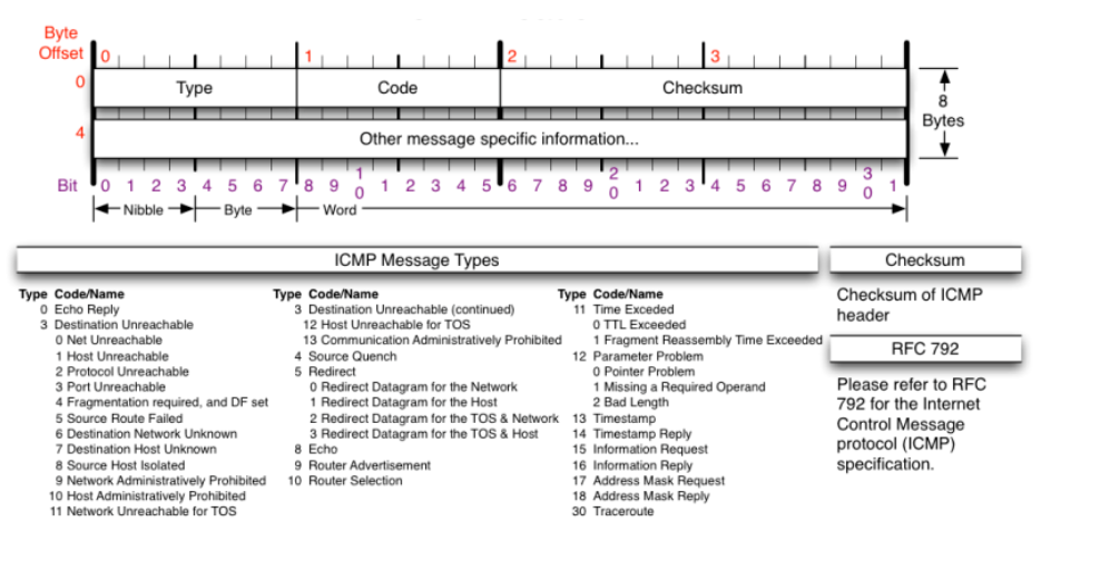 타입(Type) 항목과 코드(Code) 항목은 각각 8비트이고 오류 검사 항목은 16비트이다. 그리고 기타 항목은 32비트이다.(모든 항목이 8비트 배수 단위임) 이에 ICMP 헤더의 길이는 총 64비트다.