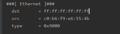 다음으로 이더넷 헤더는 아래 예제와 같다. 이때 IP/ICMP/ARP 프로토콜과 달리 이더넷 프로토콜의 전송 단위는 프레임이다. 참고로 ARP 프로토콜은 IP와 이더넷을 연결하는 프로토콜인 만큼 패킷과 프레임 사이에 있는 개념이지만 통상적으로 패킷으로 분류한다.