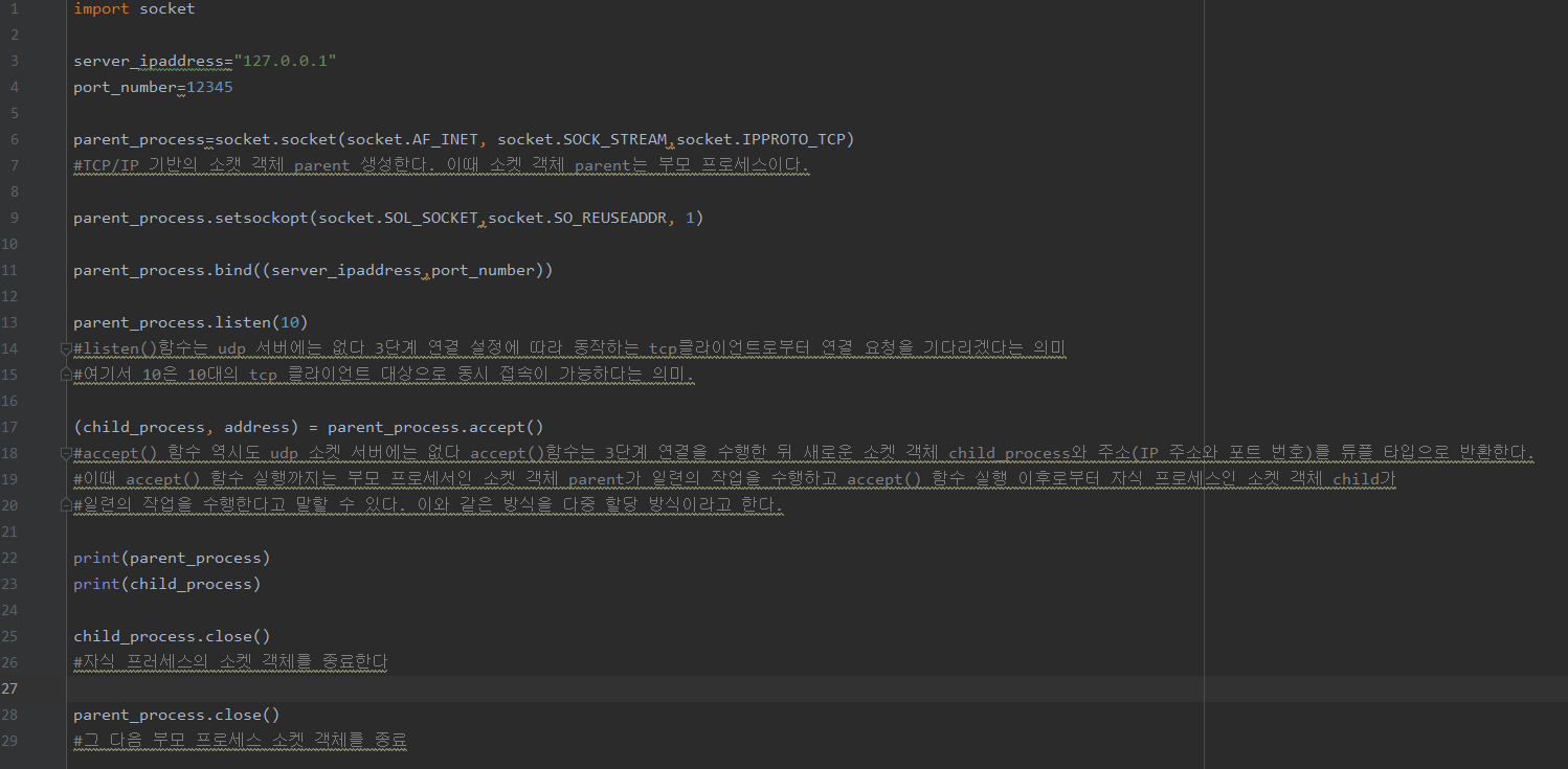 아울러 accept() 함수 실행까지는 부모 프로세서의 소켓 객체가 일련의 작업을 수행하지만,