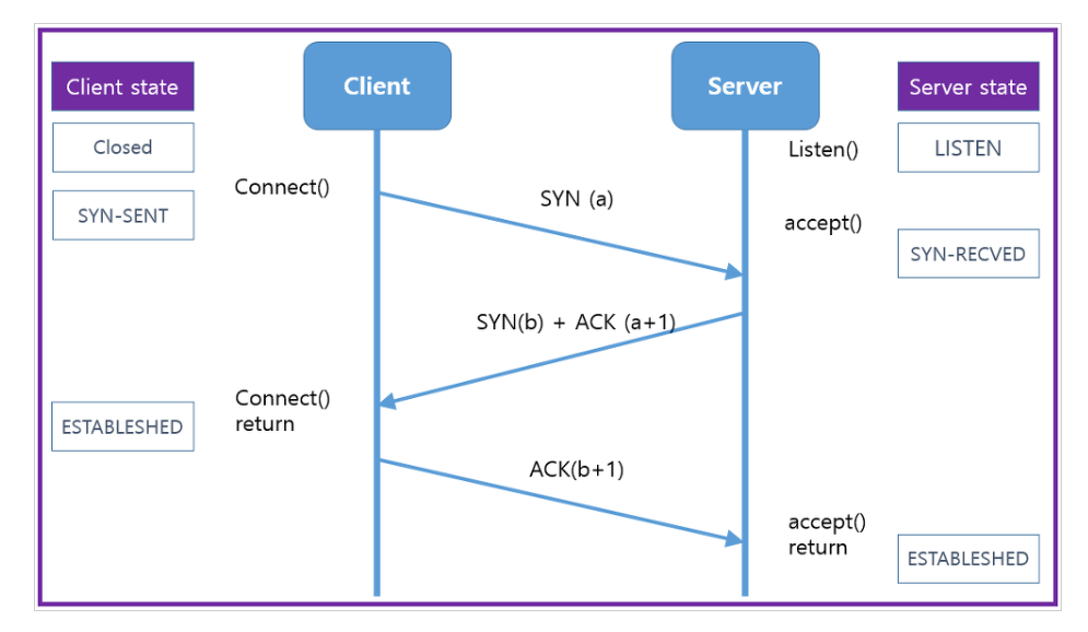 바로 3단계 연결 설정(3-way Handshaking)이 필요하기 때문이다. 이와 같이 TCP 방식으로 서버와 클라이언트를 구현하기 위해서는 무엇보다 3단계 연결 설정을 고려해야 한다.