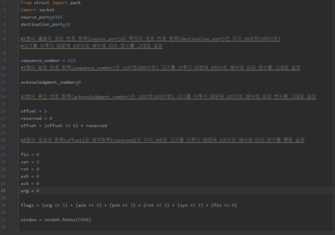 42번째 줄에서 H 형식 문자열 크기는 2바이트이고 L 형식 문자열 크기는 4바이트이고 B 형식 문자열 크기는 1바이트이기 때문에 HHLLBBHHH 크기는 2+2+4+4+1+1+2+2+2= 20바이트이며, 이것은 20바이트 크기의 TCP 헤더에 해당한다.