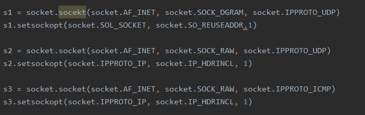 소켓 객체 s2에서 사용한 setsockopt() 함수의 기능은 UDP 헤더뿐만 아니라, IP 헤더까지 사용자가 직접 생성하도록 허용하겠다는 의미다. (socket.IPPROTO_IP, socket.IP_HDRINCL, 1). 다시 말해, 사용자가 직접 UDP 헤더와 IP 헤더를 생성하겠다는 뜻이다. 그렇다면 소켓 객체 s3 의미는 자연스럽게 이해할 수 있다.