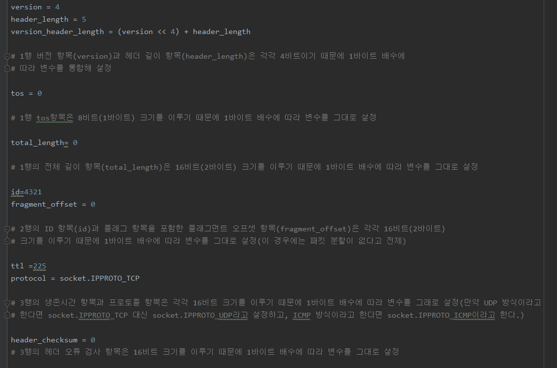 위 사진과 같이 사용자가 TCP 헤더에 이어 20바이트 크기의 IP 헤더까지 직접 구현하겠다는 의미이다.(socket.IPPROTO_IP, socket.IP_HDRINCL, 1). 이와 같이 IP 헤더의 항목 크기에 따라 각각의 변수를 설정해 IP 헤더를 작성하면 아래와 같다.