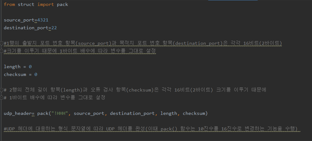 H 형식 문자열 크기는 2바이트이기 때문에 HHHH 크기는 2+2+2+2=8바이트이며, 이것은 8바이트 크기의 UDP 헤더에 해당한다.