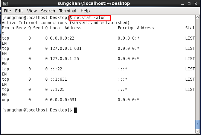 1. 먼저 netstat -atun 명령어를 사용하여 서비스를 하고 있는 포트를 확인한다.