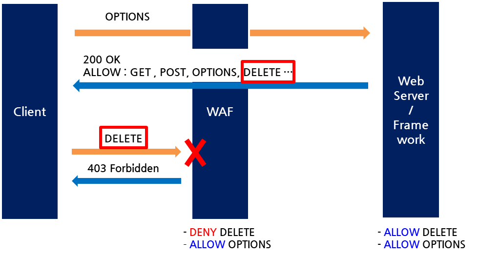WAF 내 특정 Method에 대한 차단 정책이 존재할 경우, WAF에서 특정 요청에 대해 차단해 해당 요청이 프레임워크까지 도달하지 않아 OPTIONS Method 응답과 실제 동작 결과가 일치하지 않을 것이라 예측하였다.