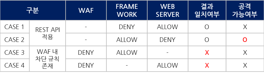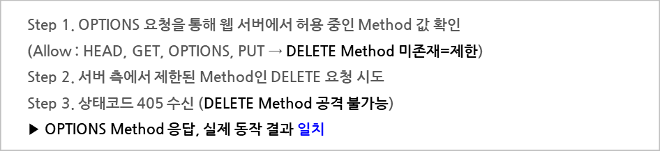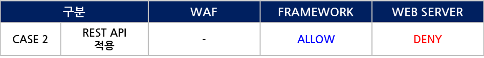 OPTIONS Method 응답과 실제 동작 결과 일치 여부를 테스트해 본 결과는 [표 9]와 같다. CASE 1, 2의 경우는 OPTIONS Method 응답과 실제 동작 결과 일치했지만, 인프라를 구성하는 시스템에 특정 Method를 제한하는 정책을 가진 WAF가 있는 경우 결과가 불일치했다.