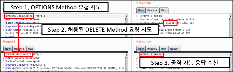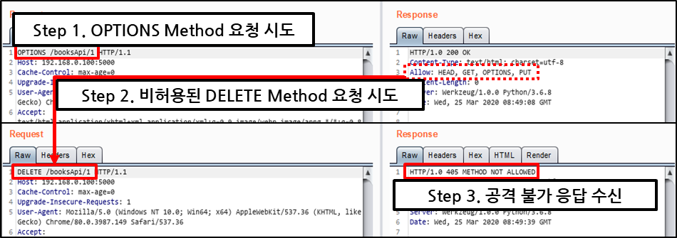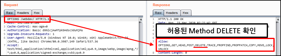 기업 취약점 진단 프로젝트를 진행하다 보면 불필요한 메스드 관련 취약점이 자주 등장하는데. 문제가 있었다 요청 패킷 부분에서 OPTIONS로 값을 주었을 때 서버 측에 허용 중인 불필요한 메소드(PUT, DELETE)가 존재한다. 하지만 실행을 시키면 실행되지 않아 이 부분을 취약을 잡을지 양호를 잡을지 정말 고민이었다. 왜냐하면 분명 서버 측에는 허용중인 불필요한 메소드가 ALLOW로 설정 되어 있다!!. 근데 실행은 되지가 않는다. 도대체 왜?? 허용이 되는데 실행은 왜 안돼?이런 고민을 한방에 해결해 준 것이 바로 이번 블로그이다. 많은 도움이 되었으면 좋겠다.
