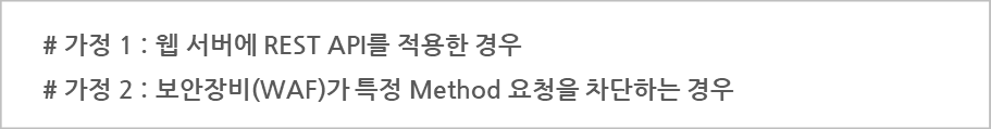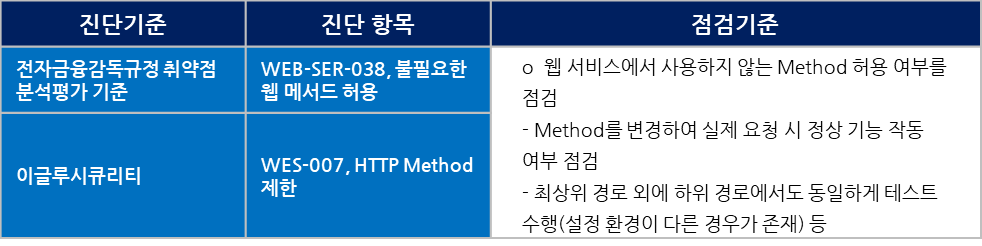 ‘전자금융감독규정 취약점 분석•평가 기준(제2020-1호)’의 ‘웹/모바일/HTS 애플리케이션’ 진단 항목 에서는 HTTP Method으로 발생할 수 있는 보안위협에 대응하기 위해서 ‘WEB-SER-038, 불필요한 웹 메서드 허용’의 점검을 권고하고 있다. 해당 항목을 조치하기 위해서는 일반적으로 WEB/WAS에서 조치가 가능하기 때문에 당사에서는 WEB/WAS 진단 시에 해당 항목에 대한 진단기준을 별도로 두고 점검을 수행하고 있다.