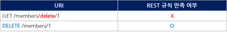 예를 들어, 요청 URI에 delete와 같이 행위(삭제)에 대한 표현이 나오면 REST 규칙을 만족한 것이 아니며, 삭제 기능은 DELETE Method를 통해 요청되어야 한다.
