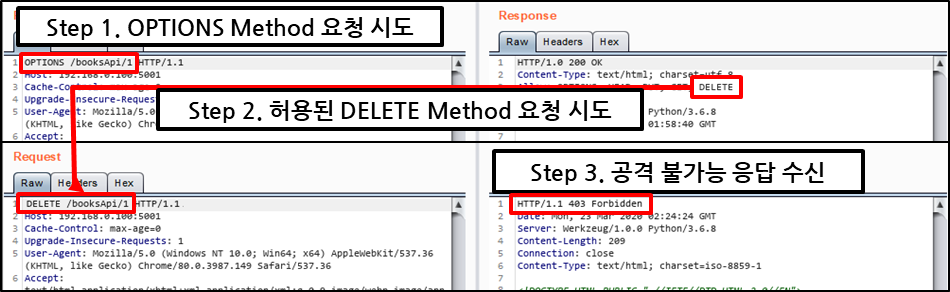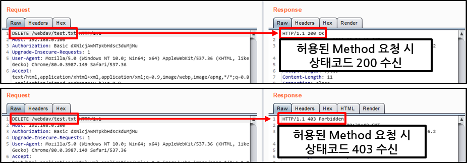 [그림 2] 허용된 Method 요청 시 상이한 응답 코드 (상 : 200 OK / 하 : 403 Forbidden)