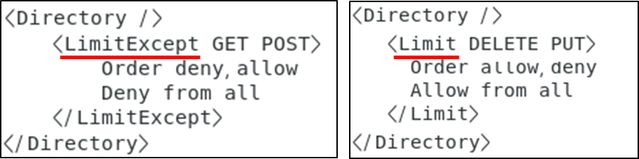 [그림 17] Apache 불필요한 웹 Method 제한 설명 (좌 : LimitExcept 지시자 이용 / 우 : Limit 지시자 이용)