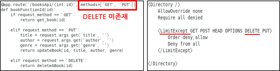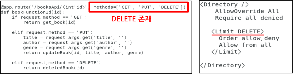 [그림 9] 설정파일 내용 (좌 : 프레임워크(FLASK) - ALLOW DELETE / 우 : 웹 서버(Apache) – DENY DELETE)