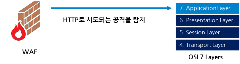 WAF는 웹 공격에 특화된 솔루션으로 OSI 7 Layer의 Application 계층에서 HTTP(80), 즉 웹 서비스로 시도되는 취약점 공격을 탐지 및 차단하는 기능을 한다. SQL Injection, XSS, 요청 Method 등에 대해 탐지 및 차단 기능을 포함한다.