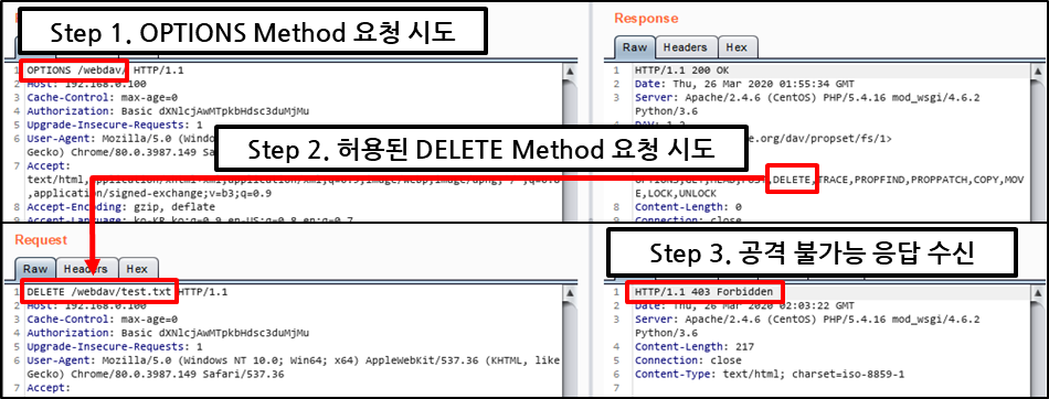 PUT, DELETE Method의 기능이 성공적으로 수행된 경우에는 [그림 2]의 상위 결과와 같이 요청의 성공을 의미하는 상태코드 200을 응답할 것이고, 이러한 경우 취약으로 판단하게 된다. 반대로 상태코드가 403인 경우에는 공격이 실패하였기 때문에 양호로 판단할 수 있게 된다. 그러나 실제 공격을 수행하게 되는 경우 OPTIONS Method의 결과와 응답결과가 상이한 경우가 종종 발생되게 된다.
