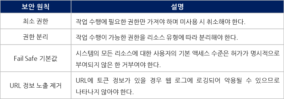 앞서 설명한 바와 같이 REST API 적용 등의 이유로 DELETE, PUT Method 차단이 불가능한 경우 사용자 별로 권한을 부여해 특정 권한을 가진 인가된 사용자의 Method 요청에 대해서만 응답해야 한다. 표준인증방식을 통해 사용자 별로 권한을 부여하여 관리할 수 있으며, 권한을 통해 관리할 경우 [표 11]의 보안 원칙을 준수하여야 한다.