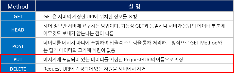 HTTP(Hypertext Transfer Protocol)는 웹 클라이언트가 웹 서버에게 요청의 목적을 알리기 위해 Method라는 수단을 이용한다. Method는 목적에 따라 GET, POST, HEAD, PUT, DELETE, OPTIONS 등으로 분류되며 사전에 정의된 행위를 수행하게 된다. 이 중 PUT, DELETE Method의 경우 임의로 서버 내 파일의 생성 및 삭제가 가능하기 때문에 비인가 사용자에 의한 조작의 위험이 있어 사전예방 관점에서 취약점 존재여부를 진단하고 대응하게 된다.