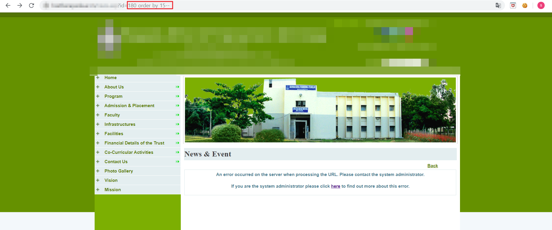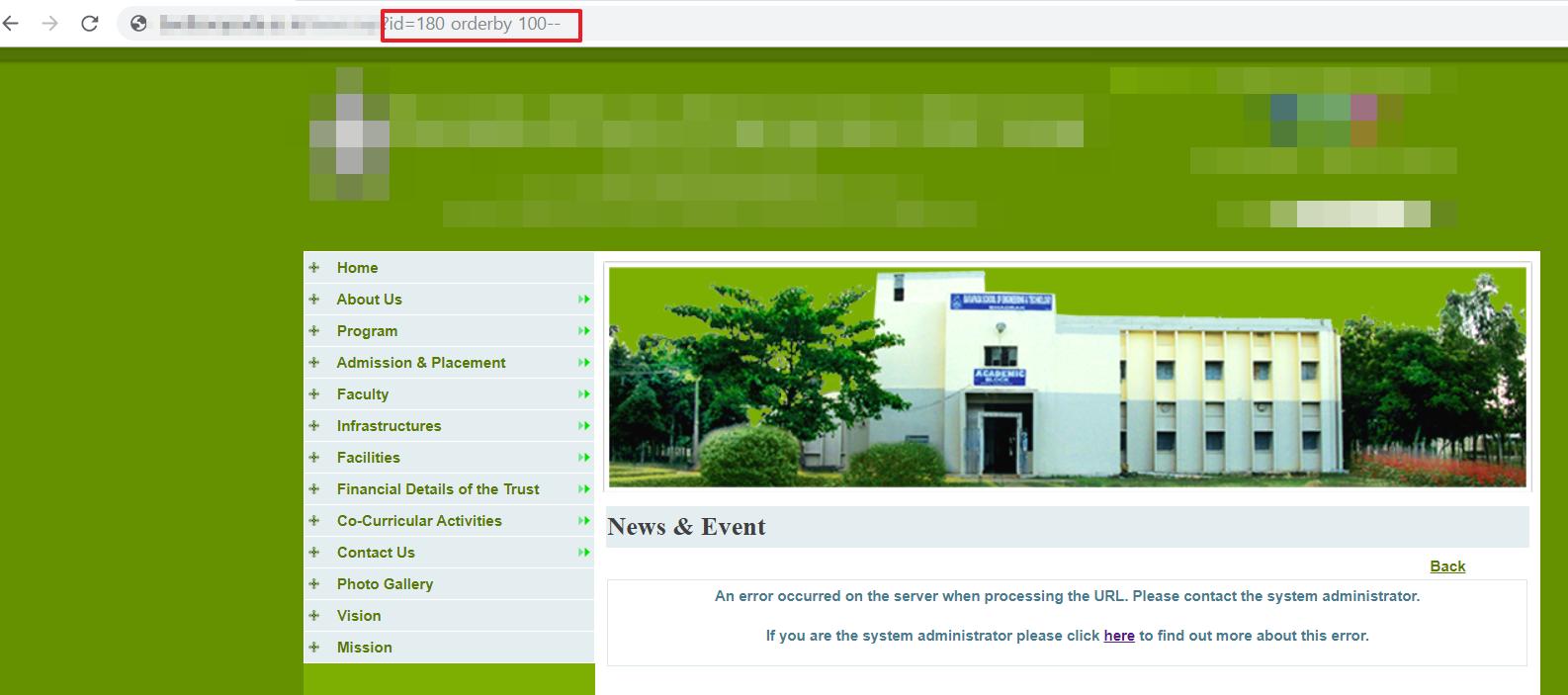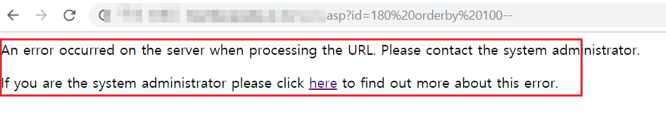 먼저 취약한 컬럼수를 파악해보자 URL경로에 id=180라는 파라미터 변수 값 뒤에 order by 100--을 넣어보자.