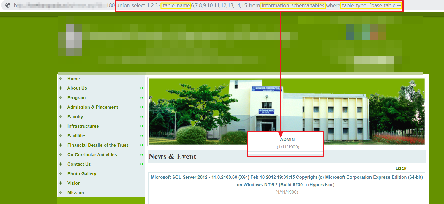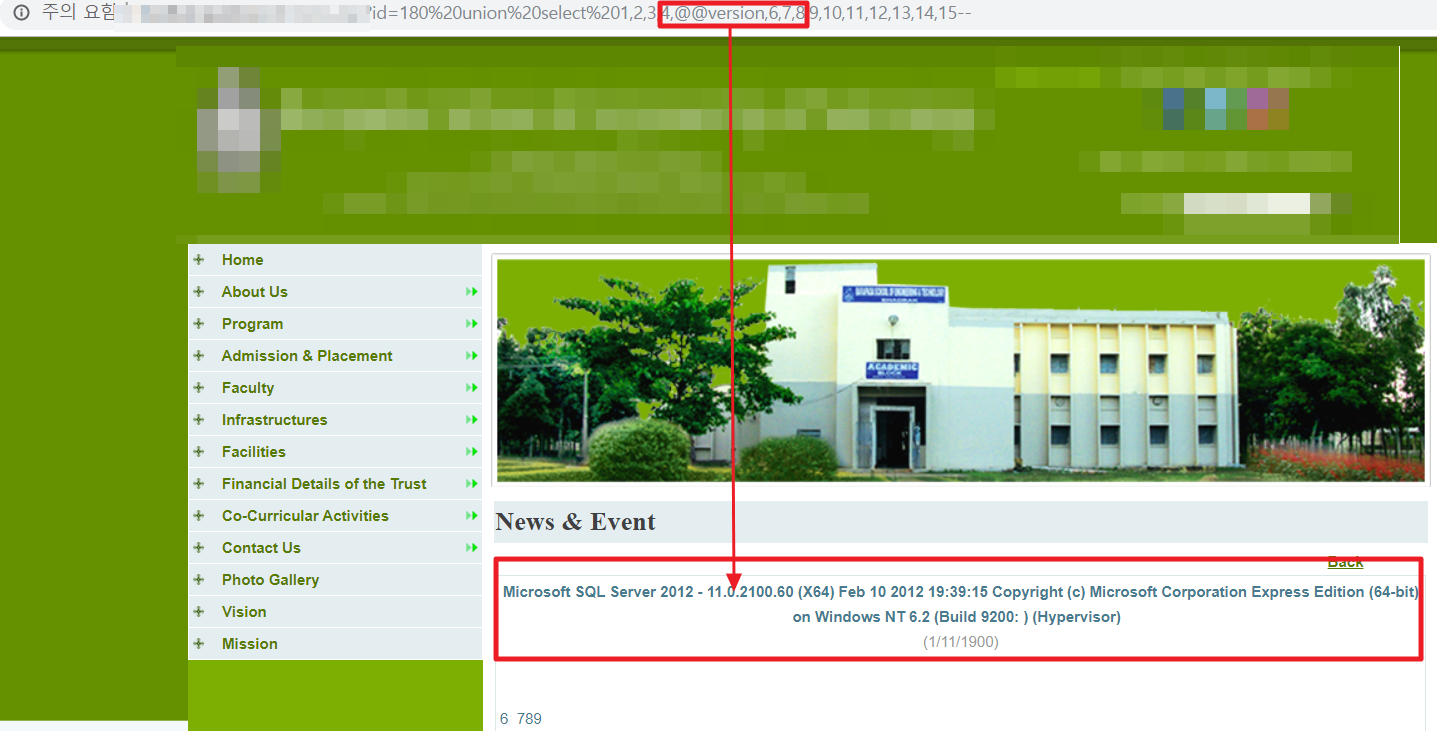 노출된 컬럼수로 이용하여 @@version(MSSQL)을 넣고 입력한 결과 해당 사이트의 버전이 노출 되었다.