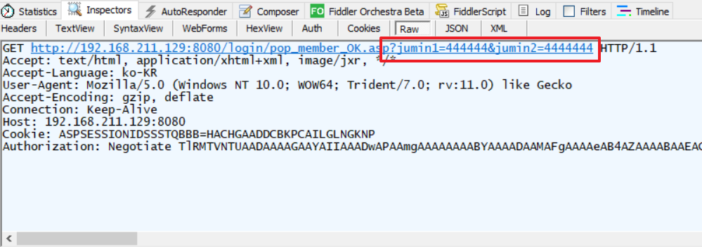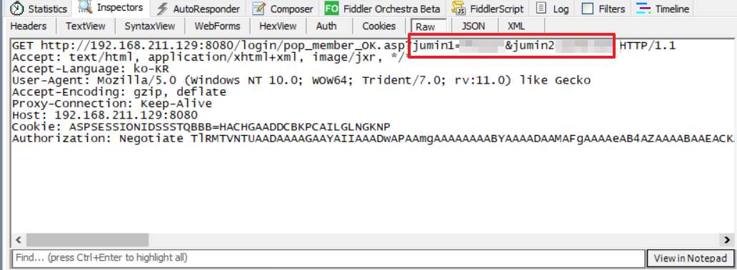 3.메모장에 해당 요창값을 옮긴 후 맨아래를 보니 jumin1/jumin2의 값이 보였다. 이 부분에다 유효치 않은 주민번호로 바꾼다.