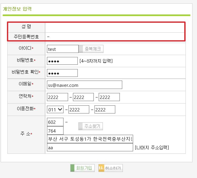 1.먼저 이미 가입을 한 사용자 정보를 입력해 보았다. 하지만 이미 가입되어 있는 주민등록본호라고 한다.
