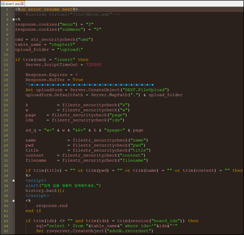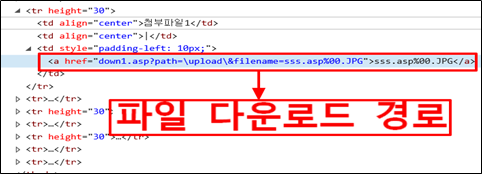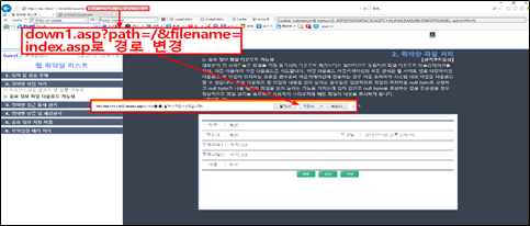 /down1.asp?path=\upload\&filename=abc.txt -> path=\&filename=index.asp로 변경시